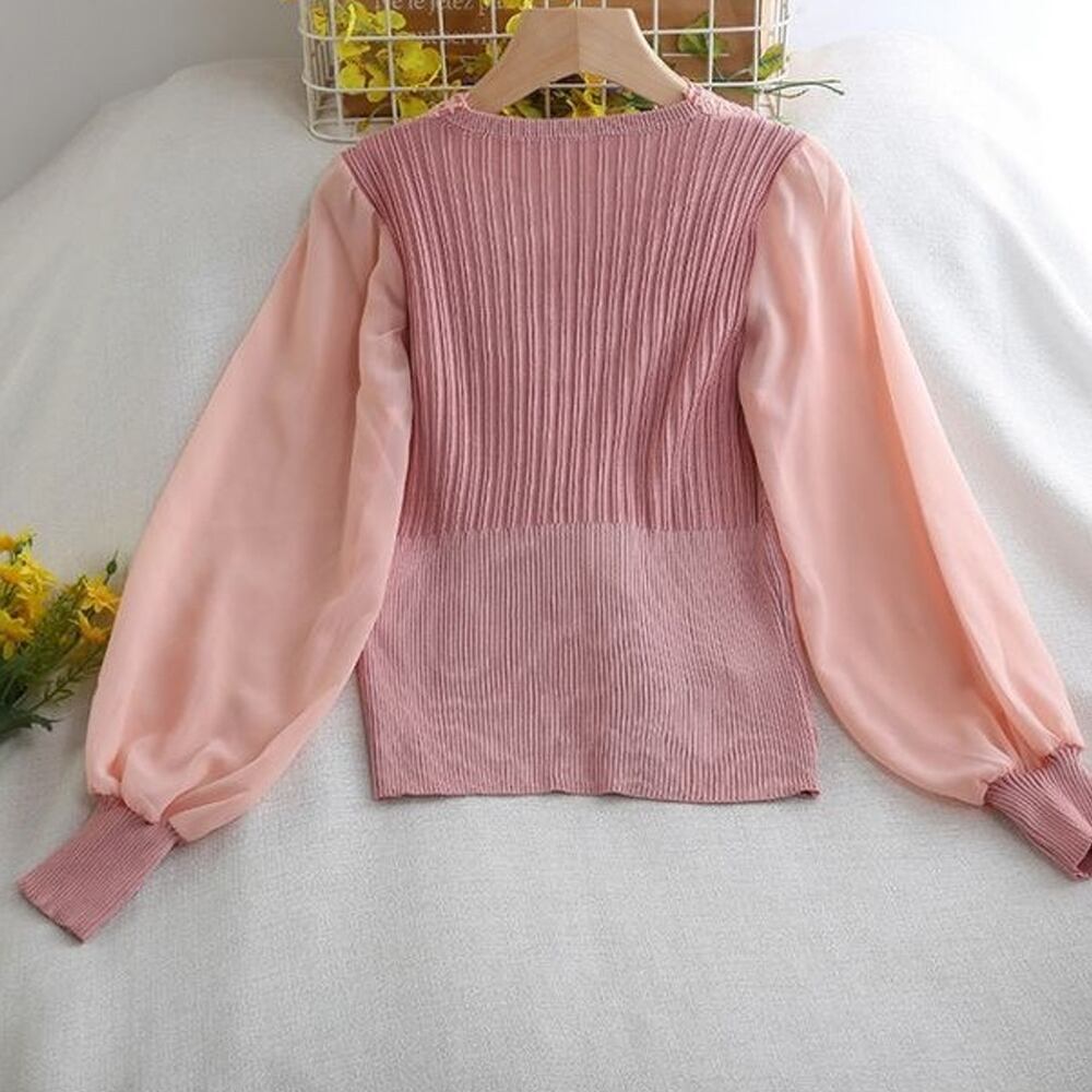 リブニット レース シフォン切り替え ニットセーター 20代 30代 ニットウェア プルオーバー 着回し 無地