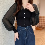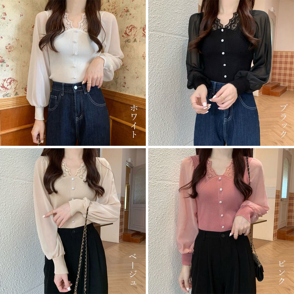 胸元繊細な刺繍レースとシフォン袖で切り替え、センシュアルなアクセントを添えた長袖ニット