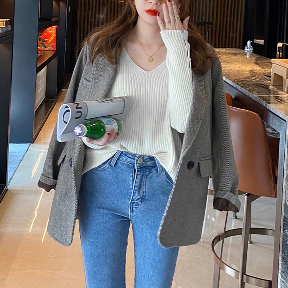 柔らかな肌触りで伸縮性の高いベーシックなVネックリブニットトップス