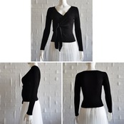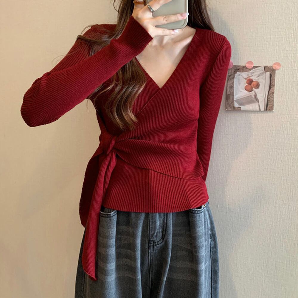 リボン結びニット/女性ニットソー無地/シンプル長袖ニット