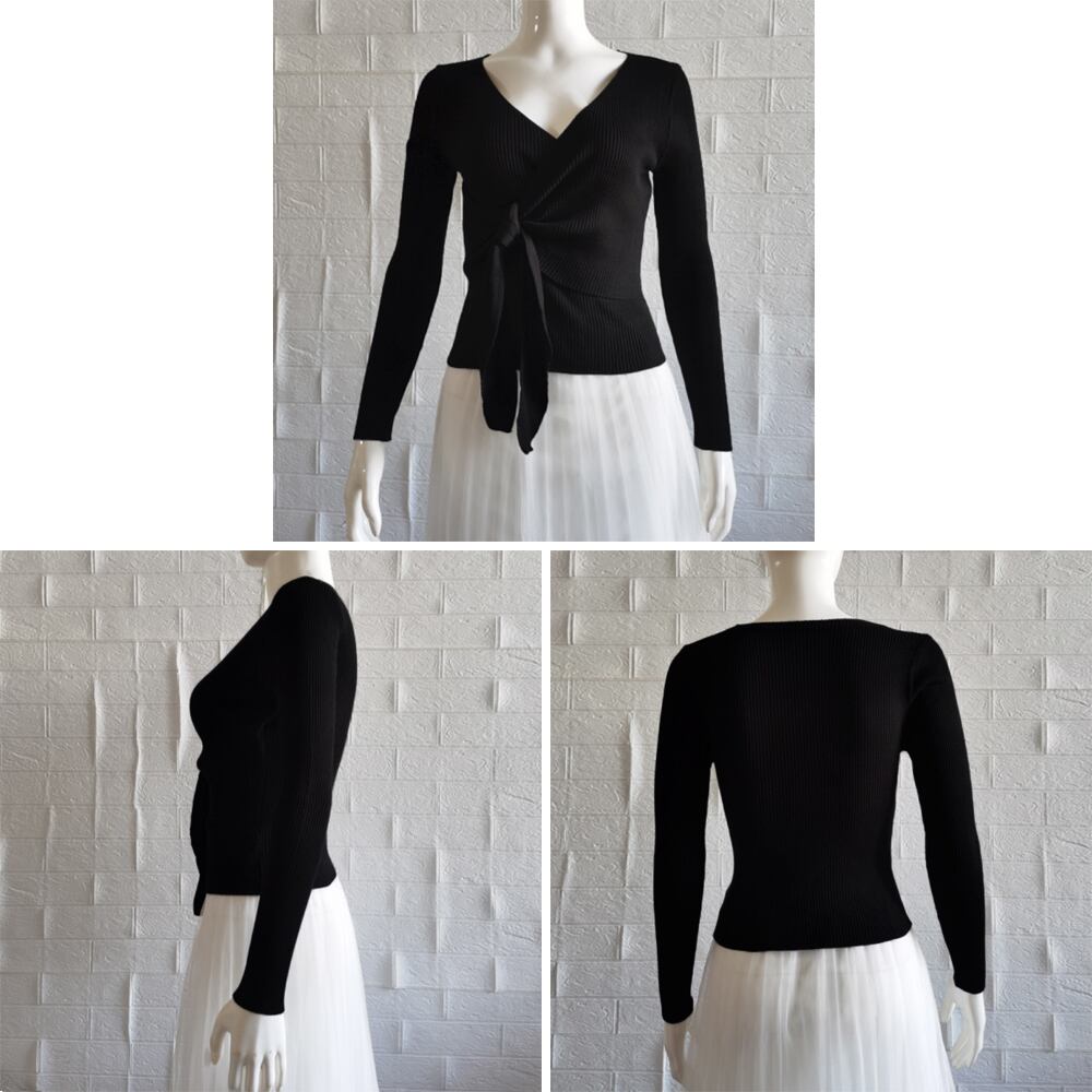 リボン結びニット 女性ニットソー無地 シンプル長袖ニット