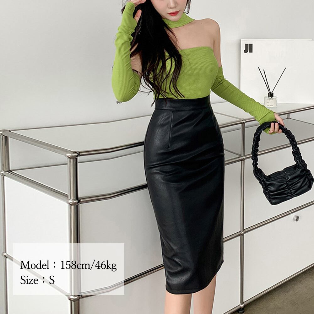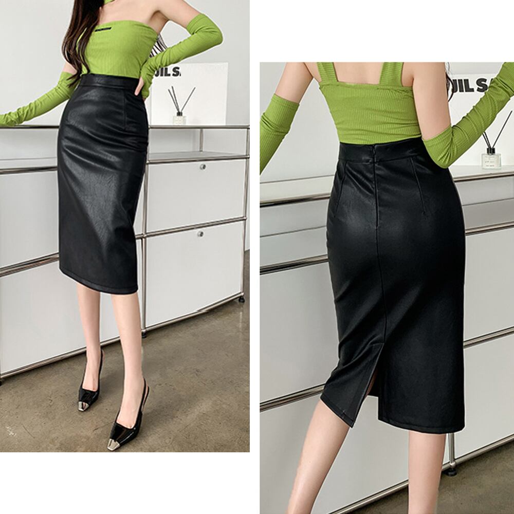 やわらかく滑らかなフェイクレザーを使用、シンプルなPUレザータイトスカート