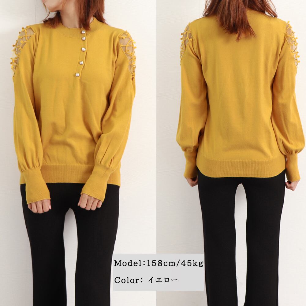 袖口と裾のリブで可愛いシルエットを引き締める、肩部分に肌魅せの透け感がとてもフェミニンで大人女性セクシーな雰囲気に