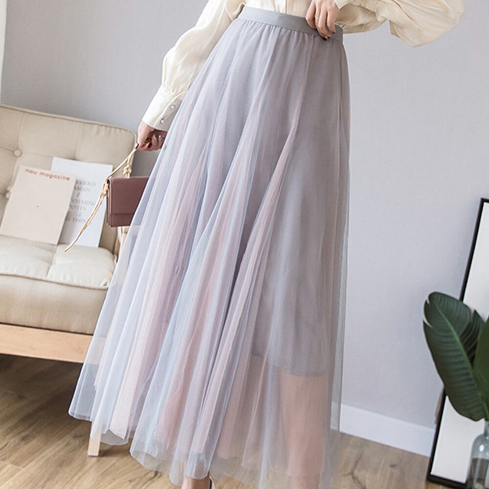 ロング丈スカート/バイカラー フレア/春秋 3層チュール