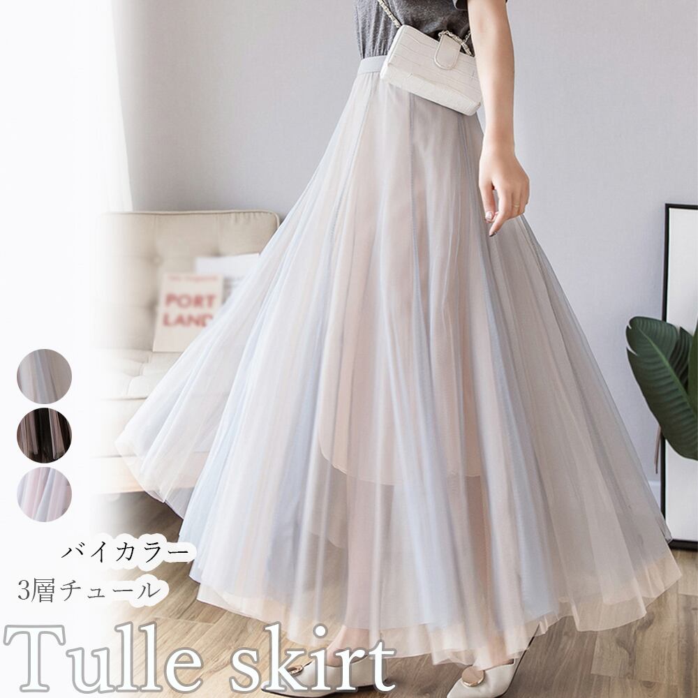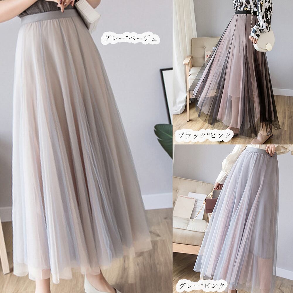 ロング丈スカート バイカラー フレア 春秋 3層チュール